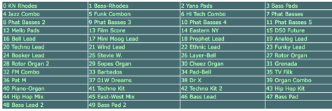 Also included in the V50 was a cool rhythm machine feature. The rhythm machine had 61 PCM samples, with polyphony of 8 samples. The rhythm machine contained 100 preset short rhythm patterns and allowed user to create 100 additional patterns. The patterns could be assembled into larger rhythm songs.